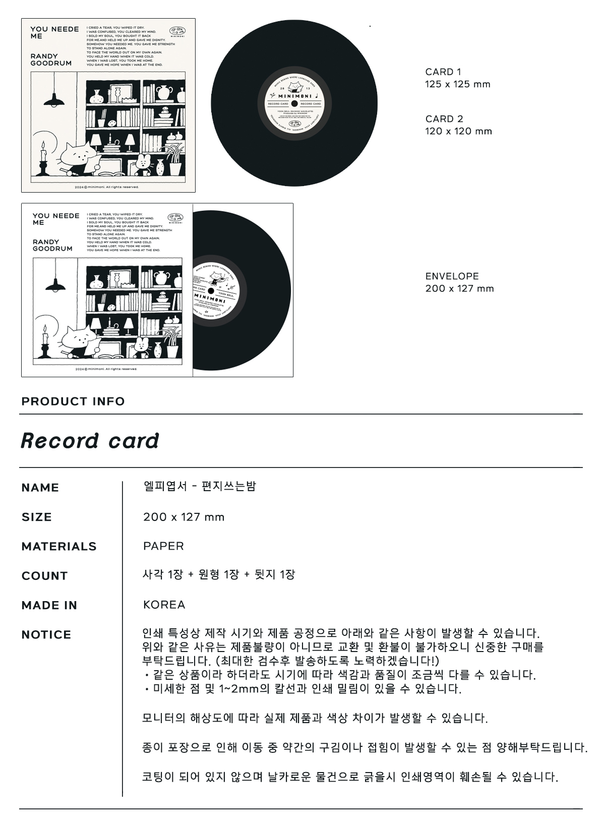 [미니모니] 편지 쓰는 밤 (칼라) 엘피 엽서