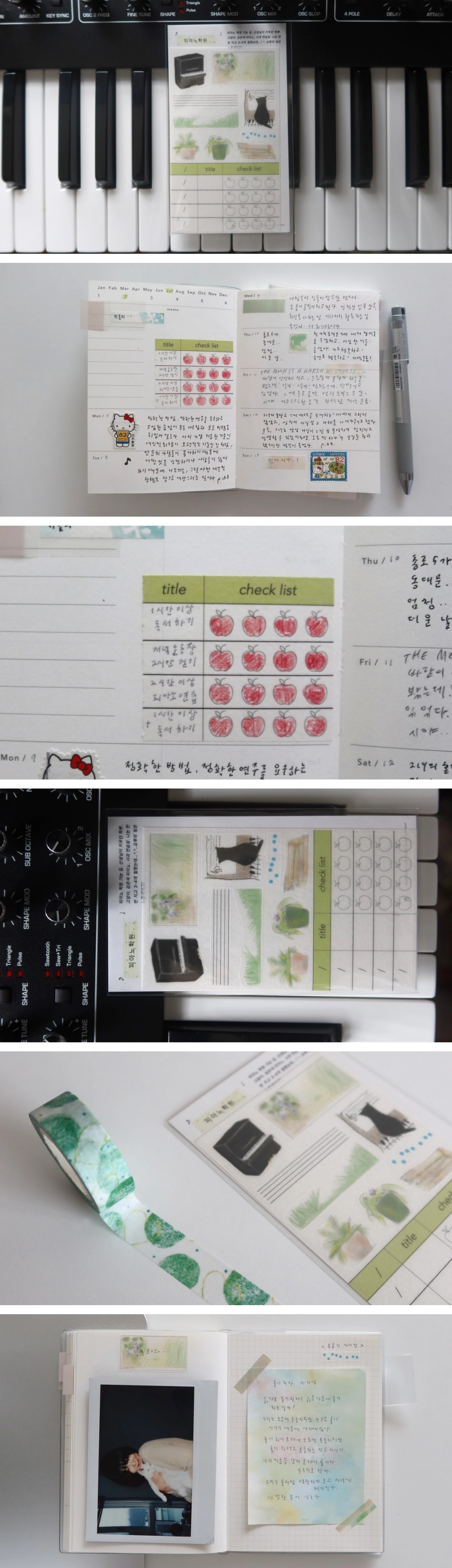 고양이. 검은색 피아노. 사과 연습장.