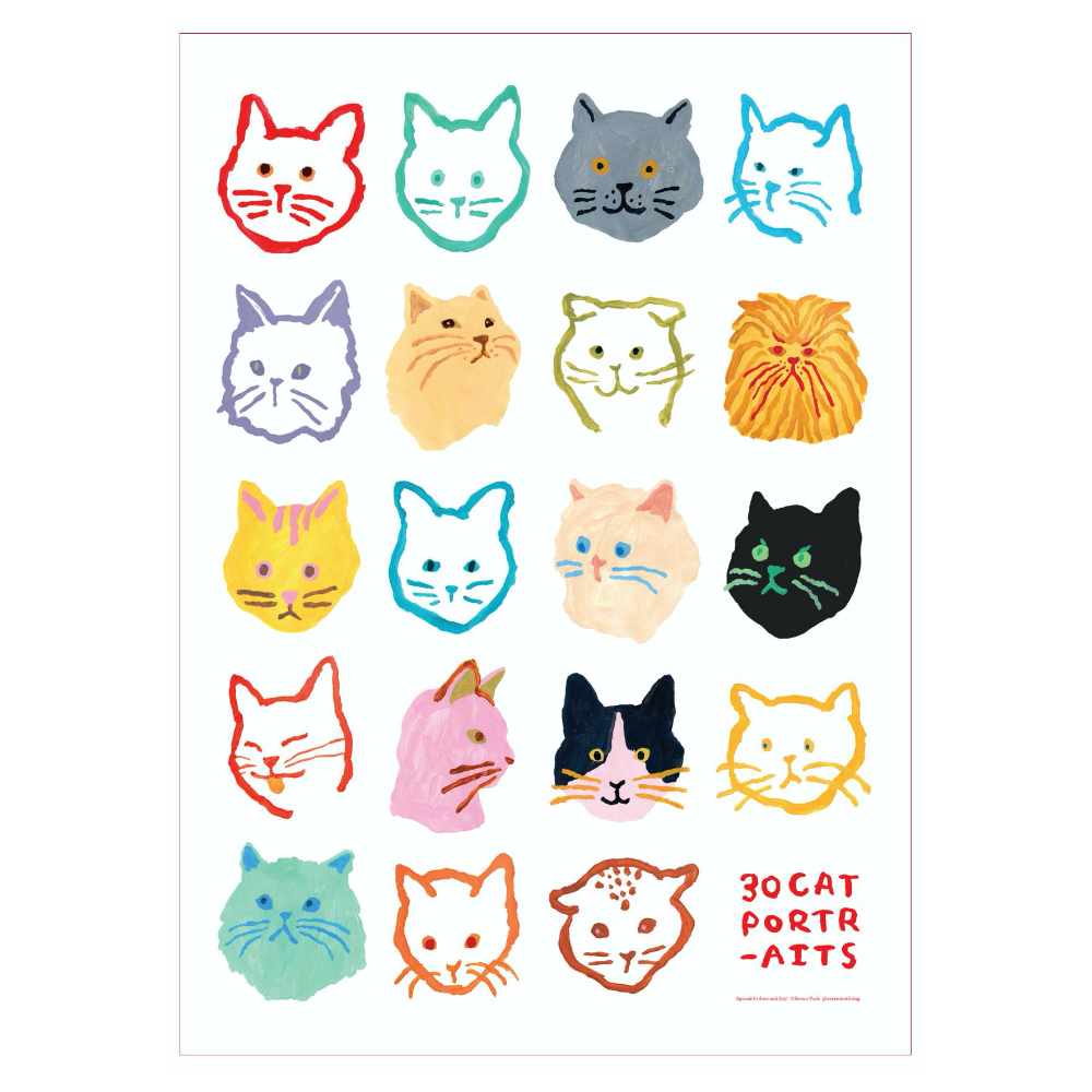 30 마리 고양이 드로잉 시리즈의 일부를 담은 대형 포스터입니다.